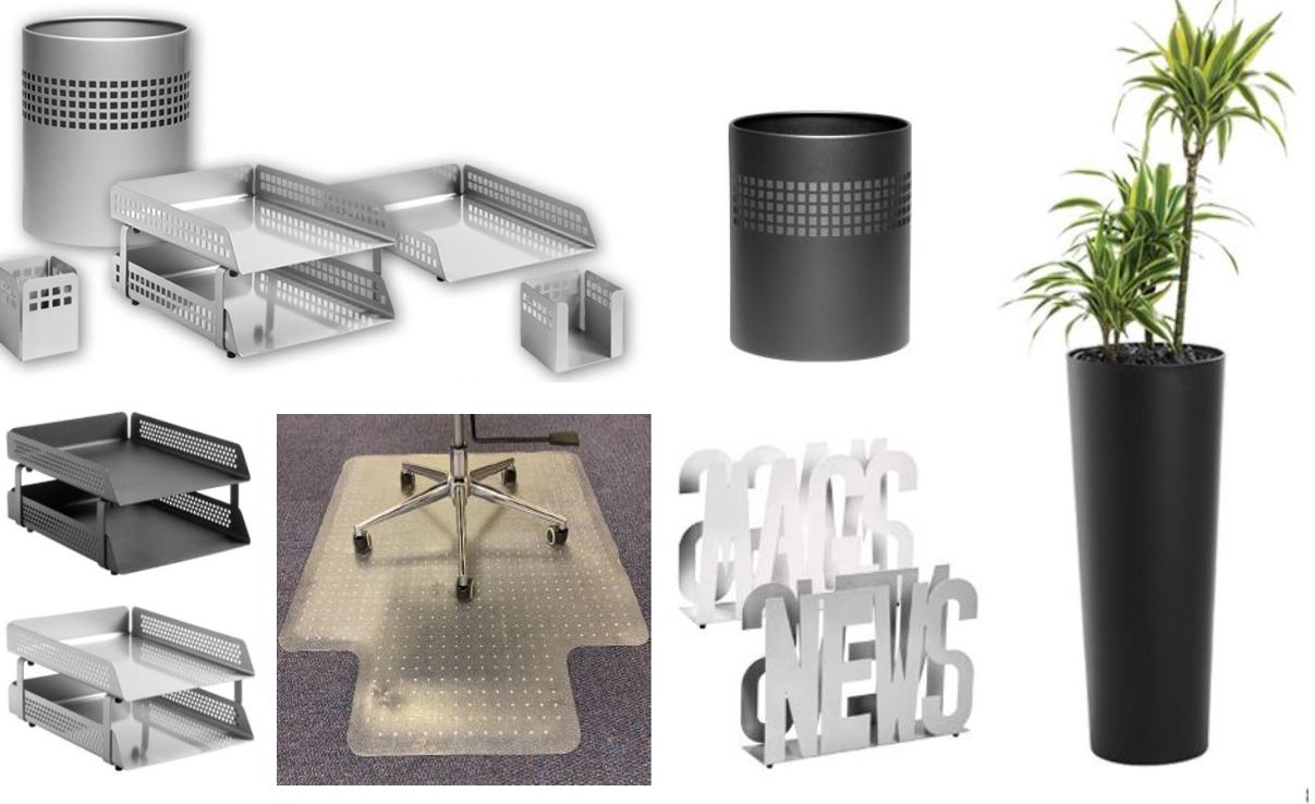 Office accessories including CPU stands, letter trays, dust bins, plant holders,hat and coat stands, desk sets, magazine racks, filing cabinets and carpet protectors are a few of the office accessories we can provide.